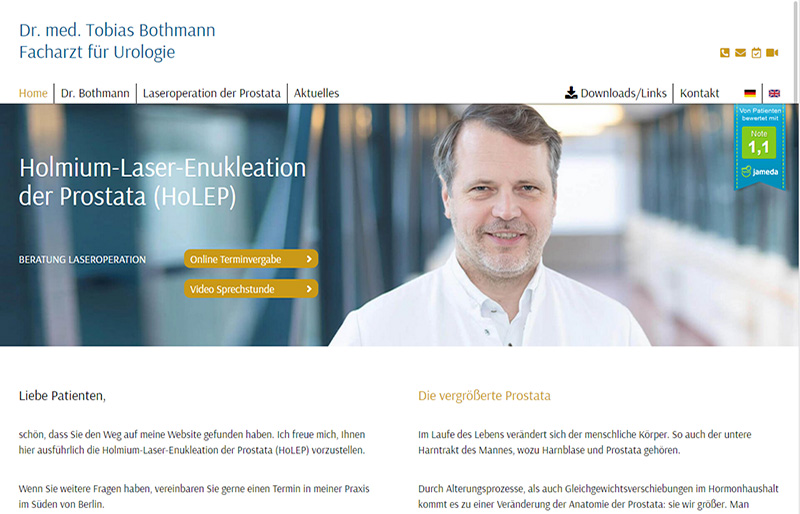 Dr. Bothmanns Schwerpunkt liegt auf der Behandlung vergrößerter Prostatae. Er bietet Beratungen zu Operationsverfahren an und führt auch selbst die Holmium-Laser-Enukleation der Prostata (HoLEP) in seiner Funktion als Leiter der Laserchirurgie der Prostata am Vivantes Humboldt-Klinikum Berlin durch. Seine urologische Praxis liegt im Süden von Berlin.