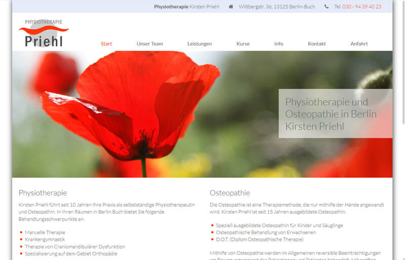 Die Praxis für Physiotherapie Kirsten Priehl hat Ihren Sitz in Berlin Karow. Therapien der Physiotherapie: Leistungen der gesetzlichen Krankenkasse und darüber hinausgehende Privatleistungen. Regelmäße Kurse: Nordic Walking, Wirbelsäulengymnastik Tai Chi, Rückenschule und Autogenes Training.