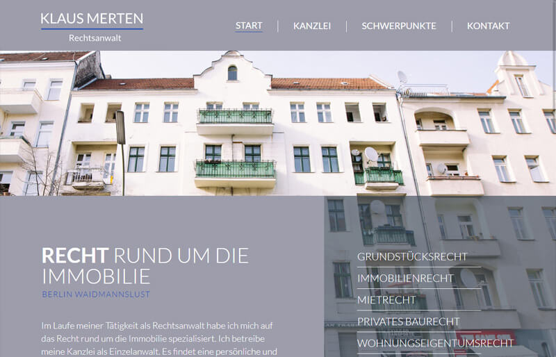 Die Rechtsanwaltskanzlei Klaus Merten in Berlin Waidmannslust ist spezialisiert auf das Recht um die Immobilie (Grundstücksrecht, Immobilienrecht, Mietrecht, privates Baurecht, Wohnungseigentumsrecht).