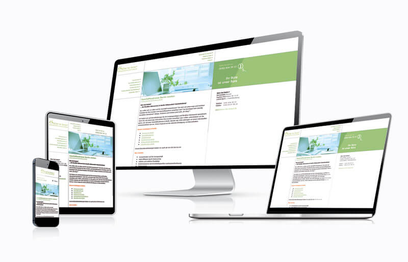 | Responsive Design (Desktop, Tablet, Smartphone) Die responsive programmierte Website passt sich automatisch an das jeweilige Endgerät an (Desktop, Tablet & Smartphone). |